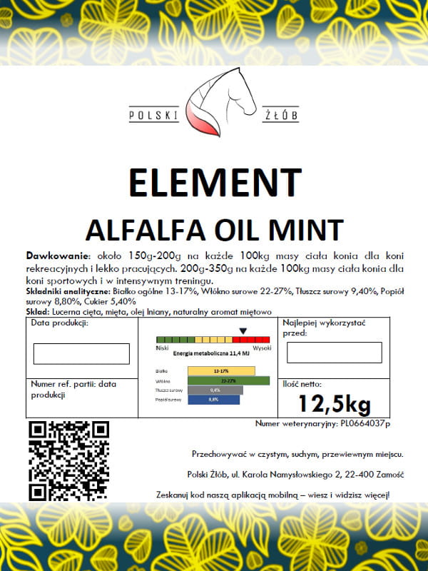 Olejowana sieczka z lucerny z dodatkiem mięty stanowi doskonałe źródło łatwo przyswajalnego białka, biotyny, beta karotenu, wapnia, żelaza oraz wielu niezbędnych do prawidłowego rozwoju oraz funkcjonowania witamin, makro i mikro elementów. Zawartość oleju lnianego pozwala na równomierne i długotrwałe uwalnianie energii oraz ogranicza frakcje pyliste sieczki co ma ogromne znaczenie dla dróg oddechowych.