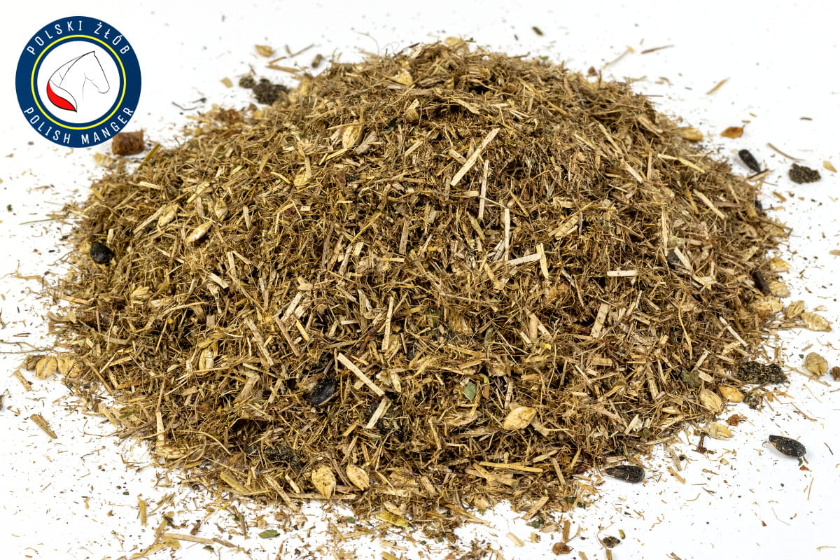 Siano łąkowe cięte , Jęczmień płatkowany , Kiełki słodowe , Makuch lniany , Sieczka ze słomy owsianej , Makuch konopny , Olej lniany , Wytłoki jabłkowe , Pestki słonecznika , Zwapniałe algi morskie , Olej konopny , Drożdże paszowe , Liść pokrzywy , Pestki dyni , Koszyczek rumianku , Tlenek magnezu , Produkt CBD , Liść melisy