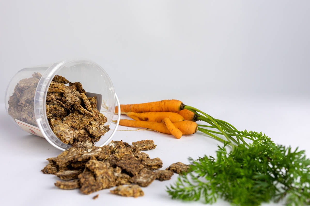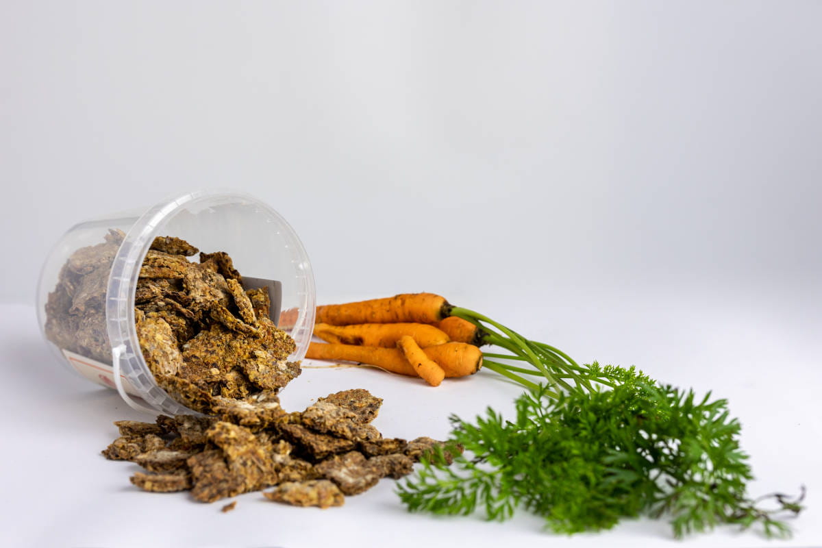 Produkt 100% naturalny bez dodatku konserwantów. Idealny jako smaczna przekąska, nagroda, dodatek w celu pobudzenia apetytu. Skład: marchewka,płatki owsiane, otręby pszenne, nasiona lnu, mąka kukurydziana, olej sojowy, woda. Analityka: Białko 10,2%, Popiół 1,6%, Tłuszcz 12%, Włókno 2% Zalecenia: maksymalna dawka dzienna 300g Smakołyki bez zawartości owsa.
