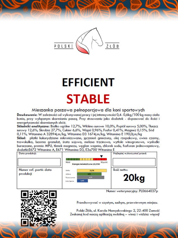 Skład: Płatki kukurydziane mikronizowane, jęczmień gnieciony, olej lniany, łuska owies czarny, siano granulowane, lucerna granulat, śruta sojowa, melasa trzcinowa, wytłoki winogronowe, wysłodki buraczane, premix MPU, tlenek magnezu, węglan wapnia, chlorek sodu, fosforan jednowapniowy, E672 Witamina A, E671 Witamina D3, E3a700 Witamina E