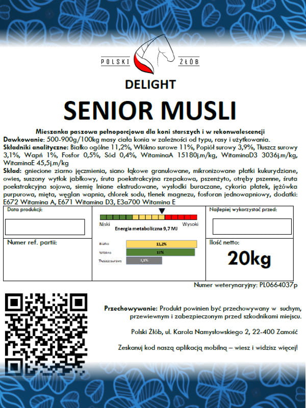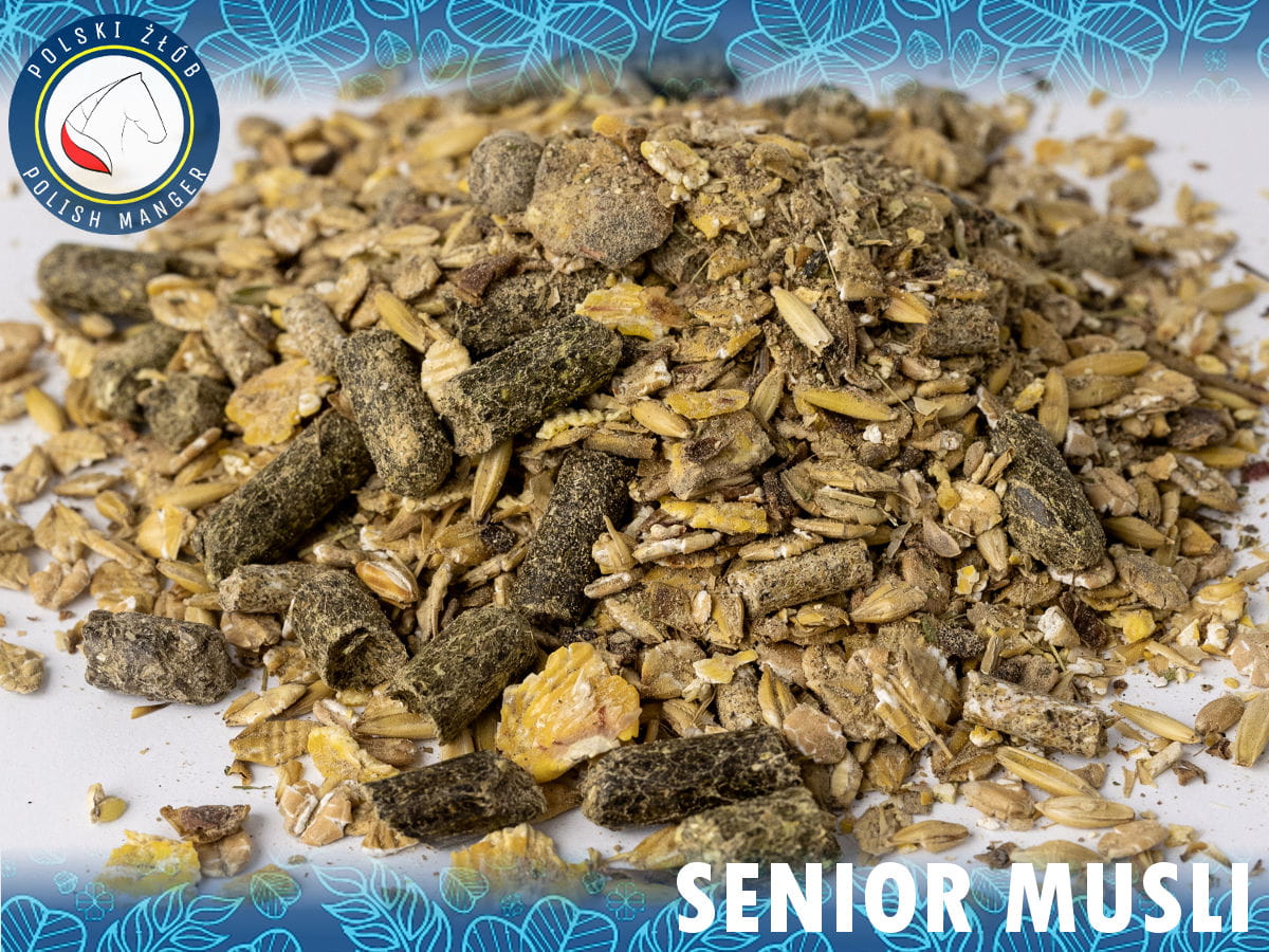 POLECANY ZESTAWOlejowana sieczka z lucerny poddana dehydratacji – zalecana jest do stosowania u koni z podejrzeniem choroby wrzodowej lub po jej przebyciu, rekonwalescentów, koni które mają problem z przybraniem na masie. Wysoka zawartość białka wspomaga proces nabierania masy. Senior Musli – Aromatyczne musli dla koni starszych i wrażliwych wszystkich typów. Bogate w zioła. Naturalne antyoksydanty zawarte w chętnie pobieranej paszy.